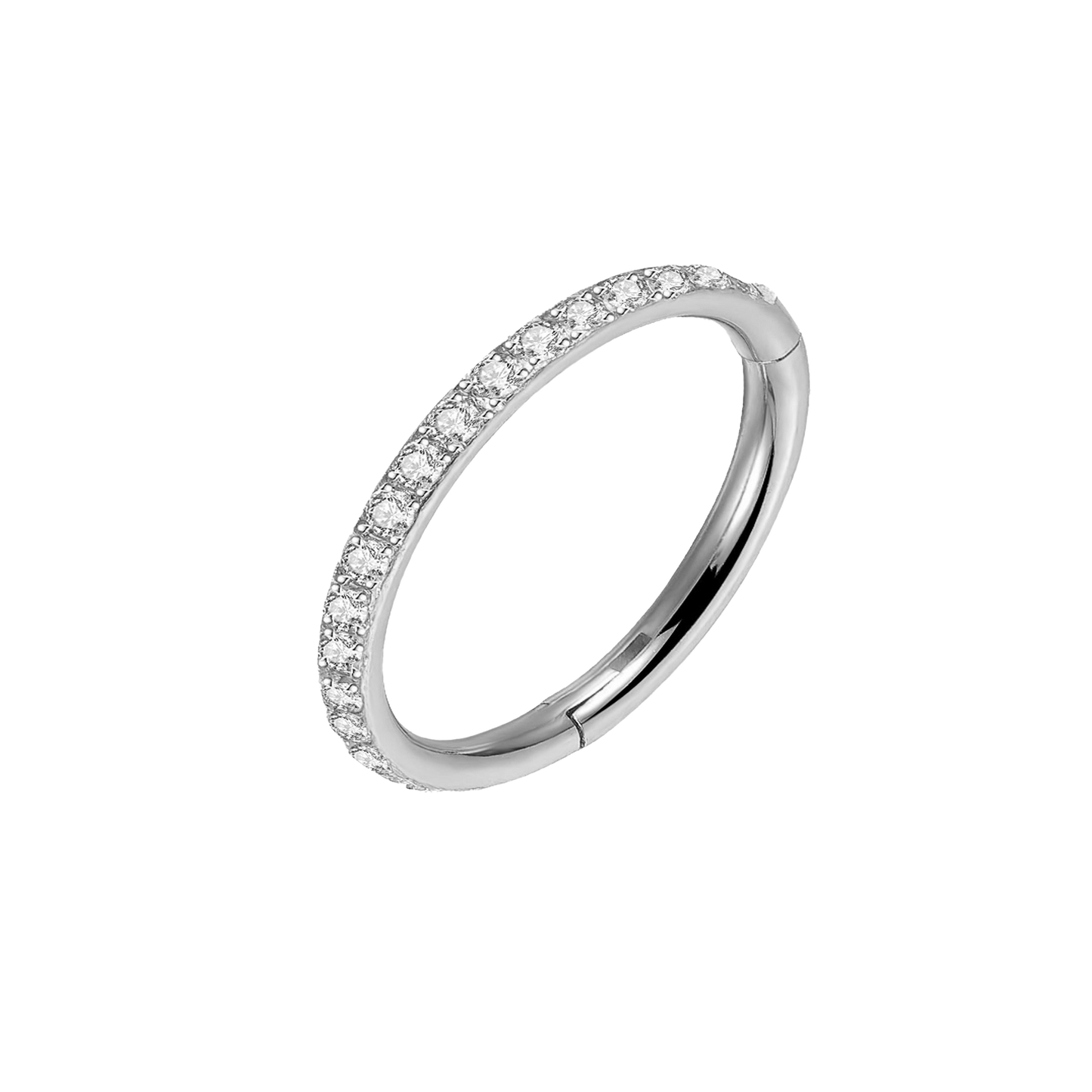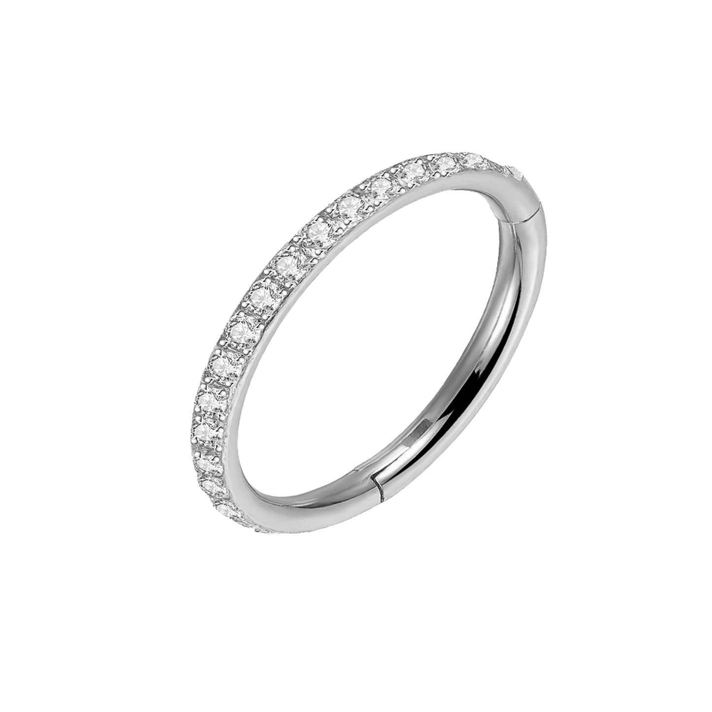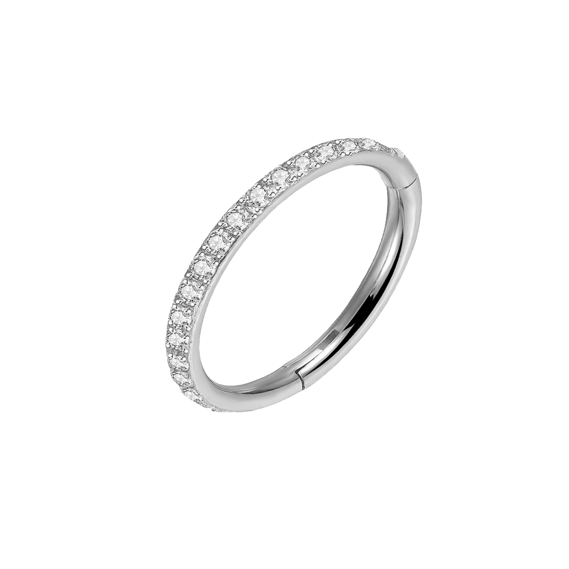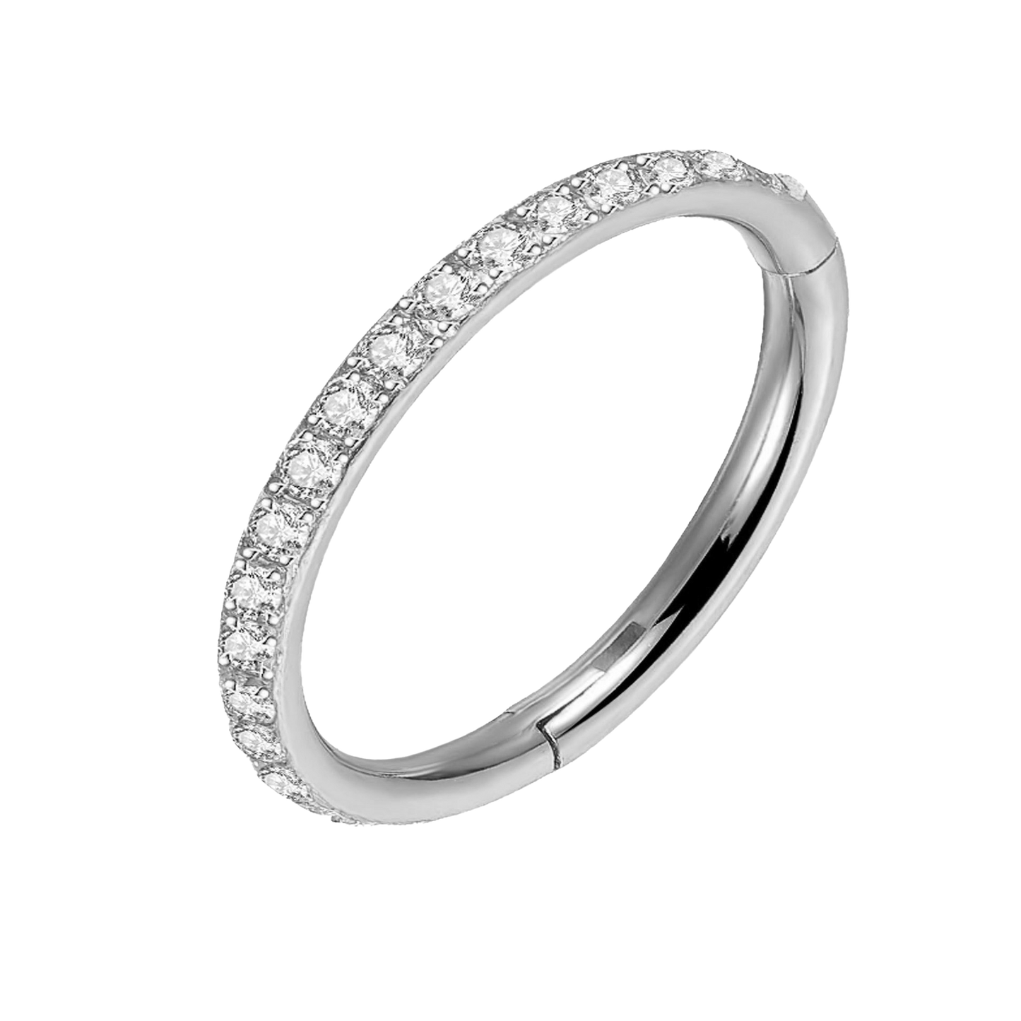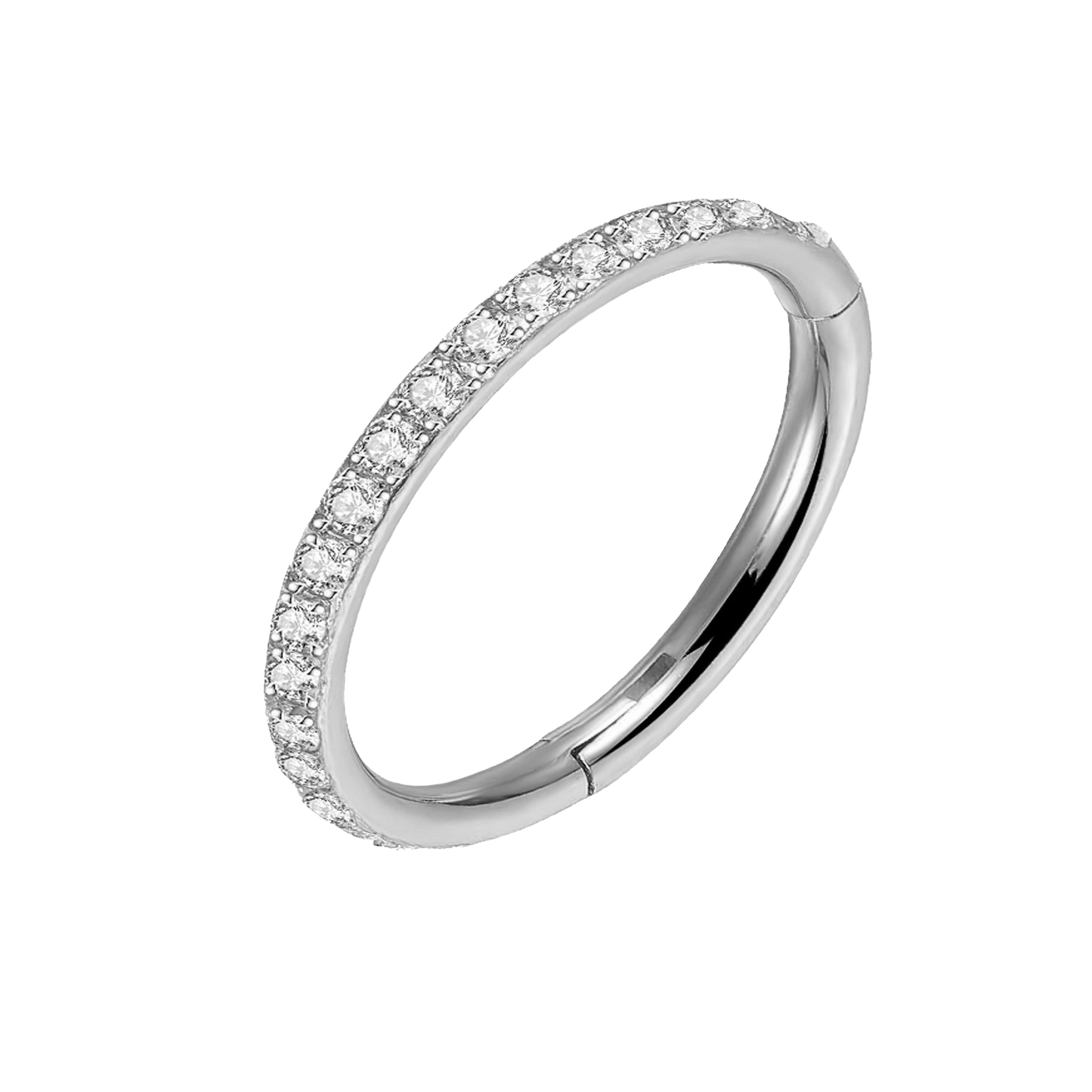 The Silver Titanium 16g outer CZ Hinged Ring is a sleek and modern piece of jewelry, crafted from lightweight and durable titanium with a polished silver-tone finish. This 16-gauge ring is adorned with a row of sparkling cubic zirconia (CZ) stones on the outer, offering a touch of elegance and brilliance. Its hinged design ensures easy opening and secure closure, making it comfortable to wear and remove. Perfect for various piercings such as the nose, septum, helix, or cartilage, this ring blends practicality with a stylish, contemporary look.